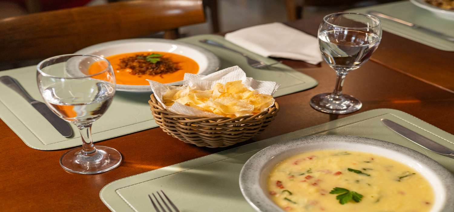 Para o almoço e jantar, servidos à la carte — almoço das 12h às 15h e jantar das 18h às 22h — nosso cardápio traz o sabor genuíno do Nordeste, com pratos como bobó de camarão, peixe de forno com molho de requeijão e leite de coco, filé mignon ao molho madeira ou gorgonzola, e o nosso famoso frango Nota 10 com creme de milho. Além disso, oferecemos massas e sopas caseiras que aquecem o coração. Não deixe de experimentar as porções de bolinhos de charque e mini pastéis, e finalize com nossas sobremesas, como bolo de rolo, brownie, pudim e picolés de frutas frescas. Para acompanhar, temos sucos fresquinhos, refrigerantes, chás e bebidas alcoólicas, como caipirinhas e vinhos selecionados. E, se preferir, o nosso room service está à disposição todos os dias, das 12h às 22h, para que você possa saborear nossas delícias no conforto da sua suíte.